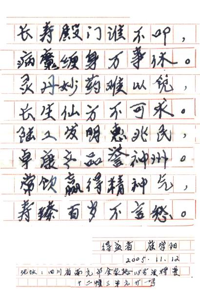 凡尊重中國(guó)古代養(yǎng)生智慧的患者,堅(jiān)持“已饑方食”和定時(shí)主動(dòng)補(bǔ)水者,均可祛病康復(fù)。如牡丹江醫(yī)學(xué)院87歲的張鵬圖飲用半年后高血壓未痊愈,陸江與他通話交流,了解他原先每日主食4兩,建議他用“已饑方食”減少主食肉食量,他理解后,將每日主食減為3兩,少吃兩塊肉,飲用一年治愈26年的冠心病和高血壓。他2003年5月31日來信說:“飲用卓康小分子團(tuán)水是根治高血壓、冠心病、糖尿病的一把金鑰匙,是填補(bǔ)醫(yī)學(xué)空白,為人類造福,應(yīng)推廣該產(chǎn)品。”