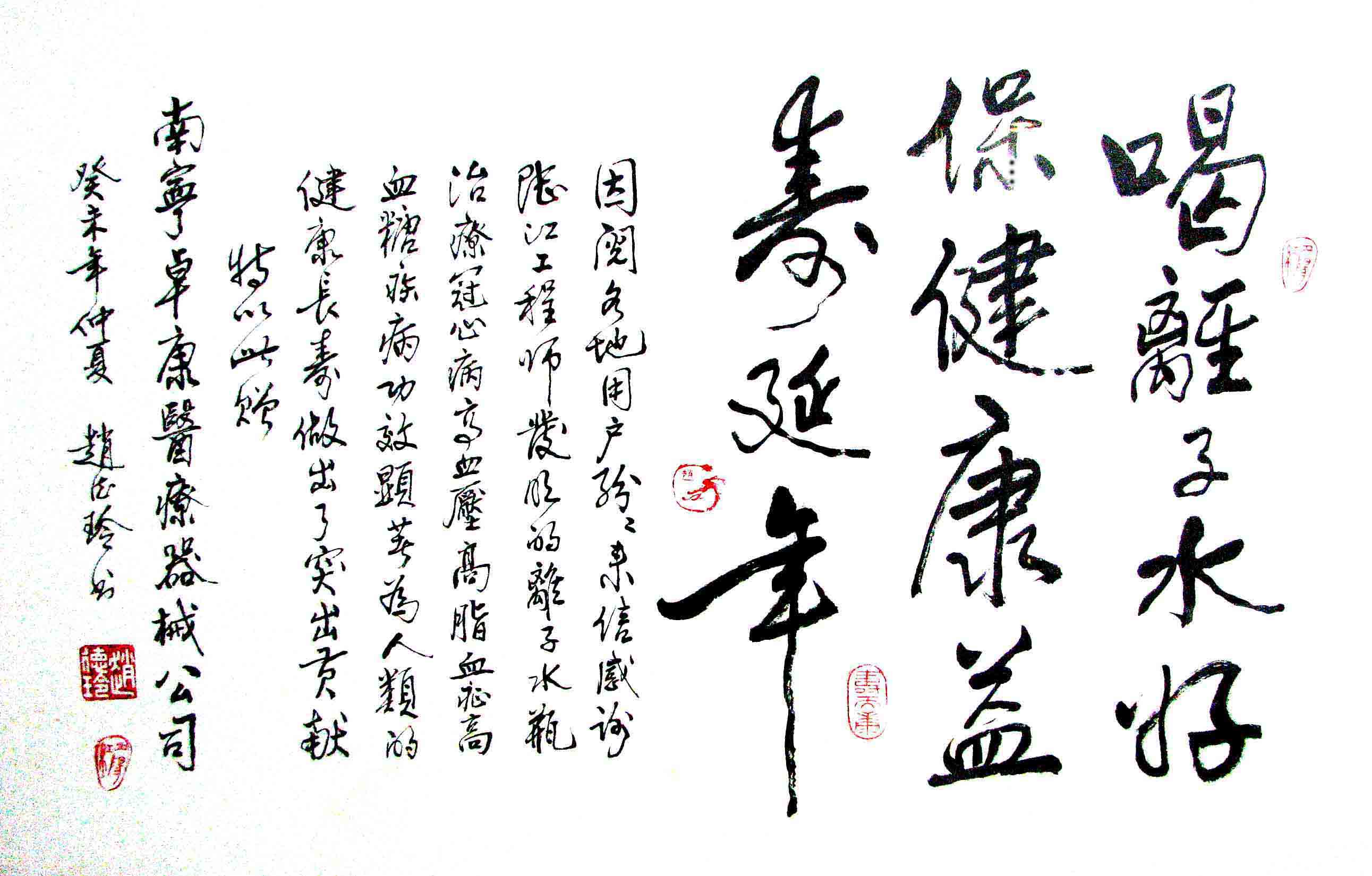 - -- 幾千年來,人類靠醫(yī)藥不能根治冠心病、高血壓和糖尿病,如想根治,那是夢(mèng)想。可是,我從中國(guó)基礎(chǔ)醫(yī)學(xué)研究成果受到啟發(fā),研發(fā)了一種發(fā)明產(chǎn)品,處理出微小分子團(tuán)水讓人飲用,實(shí)現(xiàn)了人類這一夢(mèng)想!患者飲用后遠(yuǎn)離了冠心病、高血壓和2型糖尿病。這一成果曾經(jīng)過臨床試用和專家鑒定,作為準(zhǔn)字號(hào)醫(yī)療器械讓廣大患者飲用,療效進(jìn)行跟蹤調(diào)查。很多患者的反饋情況令人感動(dòng),我放在公司網(wǎng)站上(nnzk.com),震撼了醫(yī)學(xué)專家,也使廣大同胞受到啟發(fā)。人們盼望飲用它給細(xì)胞補(bǔ)水,治愈多種病癥,既省錢,又安全,而且延長(zhǎng)壽命。