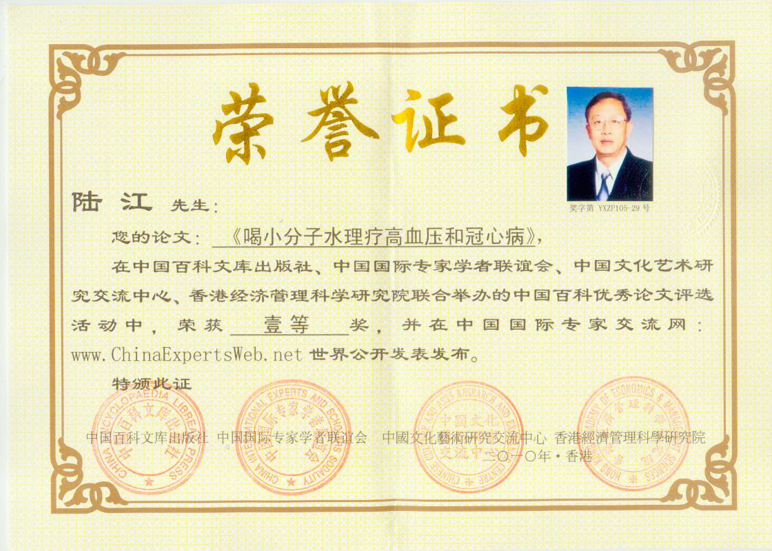 -----我是從事建筑的高工,本來沒有資格去攻克醫(yī)學(xué)難題,卻為了自身健康才扣響醫(yī)學(xué)的大門。由于我1990年患高血壓,因怕中風(fēng)才研究發(fā)明了離子水瓶,我把水處理成微小分子團(tuán)水,飲用后治愈了高血壓。便于1993年底送到三家省級(jí)醫(yī)院做臨床試用4個(gè)月。經(jīng)北京和廣西醫(yī)學(xué)專家鑒定:"降脂降壓效果好"," 能擴(kuò)大心腦動(dòng)脈流量,改善心腦電圖以及微循環(huán)","對(duì)治療心腦動(dòng)脈粥樣硬化、高血壓、高血脂有良好的醫(yī)療保健作用。""產(chǎn)品的技術(shù)性能和療效達(dá)到了同類產(chǎn)品的國(guó)內(nèi)領(lǐng)先水平,經(jīng)廣西醫(yī)學(xué)科學(xué)情報(bào)研究所檢索,未見國(guó)外有類似報(bào)道。"中國(guó)醫(yī)學(xué)科學(xué)院張正國(guó)教授從美國(guó)國(guó)立醫(yī)學(xué)圖書館數(shù)據(jù)庫(kù)存Medline檢索英俄文資料,均未見類似報(bào)告。2000年上市后,我為了對(duì)消費(fèi)者負(fù)責(zé)而繼續(xù)觀察研究,一直通過《信譽(yù)卡》和《質(zhì)量跟蹤調(diào)查書》向患者承諾療效,請(qǐng)用戶使用6個(gè)月后反饋效果。和脂壓患者飲用2至5個(gè)月內(nèi),消除癥狀,停服藥物,血壓正常;冠心病患者飲用3~5個(gè)月逐漸減輕至消除心絞痛、房顫等癥狀,不再服藥,飲用1年左右心電圖正常,經(jīng)冠脈造影掃描無明顯狹窄,表明冠心病痊愈。大量患者還反映許多衰弱器官被修復(fù),讓前列腺增生、慢性咽喉炎、慢性氣管炎、支氣管炎、慢性胃炎、腸炎和膽囊炎等不藥而愈;2型糖尿病患者是因?yàn)橐葝u衰弱致病,飲用該水半年至一年,逐漸減藥至停藥,血糖尿糖正常,真正治愈2型糖尿病。中風(fēng)后遺癥患者飲用六七個(gè)月,可逐漸減輕至消除肢體和語言障礙,表明飲用該水能讓壽命很長(zhǎng)的神經(jīng)元細(xì)胞逐漸修復(fù),奇跡般地恢復(fù)肢體和語言功能。飲用后還使胸腺和脾臟兩個(gè)重要的免疫器官被修復(fù)和增強(qiáng),產(chǎn)生免疫細(xì)胞多,提高了免疫力,使人不生病或少生病。自此, 飲用微小分子團(tuán)水創(chuàng)造了攻克冠心病、高(低)血壓和糖尿病三大醫(yī)學(xué)難題的奇跡。人們對(duì)此感到不可思議,但實(shí)踐是檢驗(yàn)真理的唯一標(biāo)準(zhǔn)。